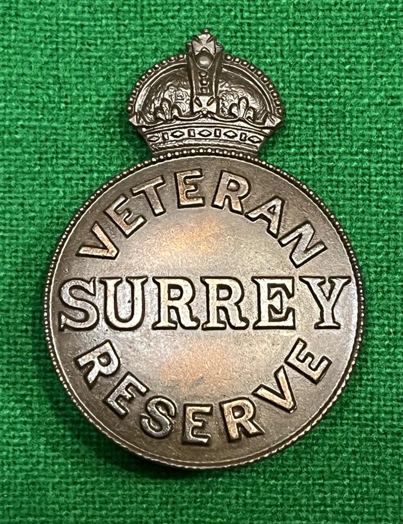 A pre WW1 Surrey Veteran Reserve lapel badge. The design was originally registered in 1910 and continued throughout WW1. Excellent, clean condition, complete with original card box.