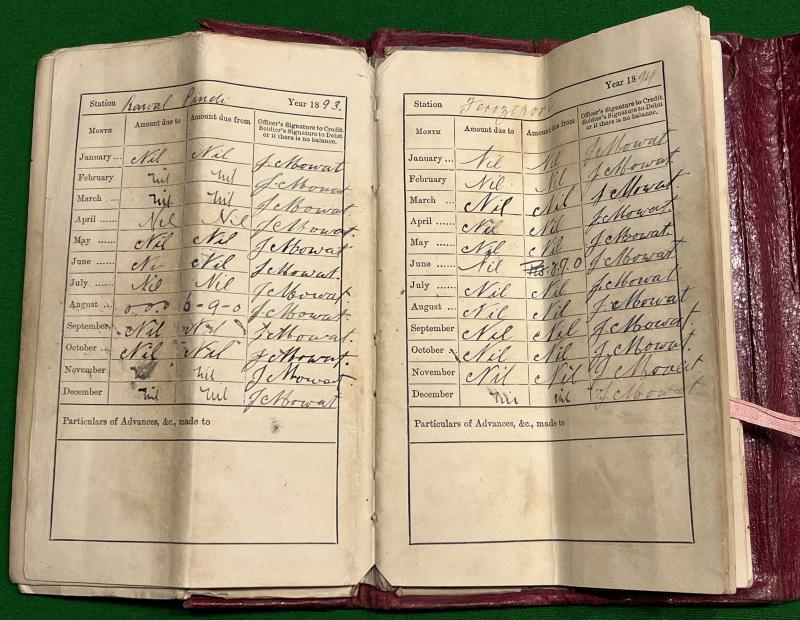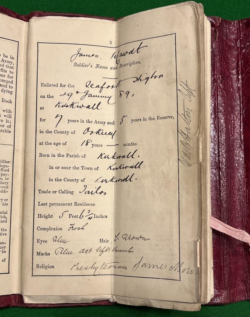 This leather bound example was issued to 2956 James Mowat, Seaforth Highlanders. Mowatt joined the regiment in 1891 from his home in Kirkwall, Orkney and saw service in India. Good, used condition, elastic retainers now slack.