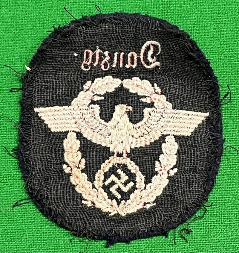 Feuerschutzpolizei, Fire protection police sleeve eagle for Danzig. Dark blue wool with pink cotton embroidered eagle and City designation. Formerly the Free City of Danzig, the city was incorporated into the Third Reich and by 1945 was largely in ruins and is now part of Poland.