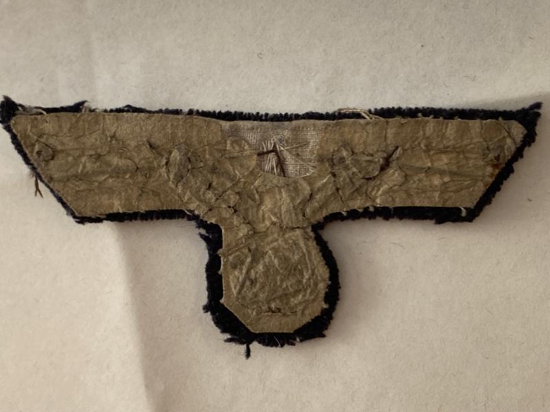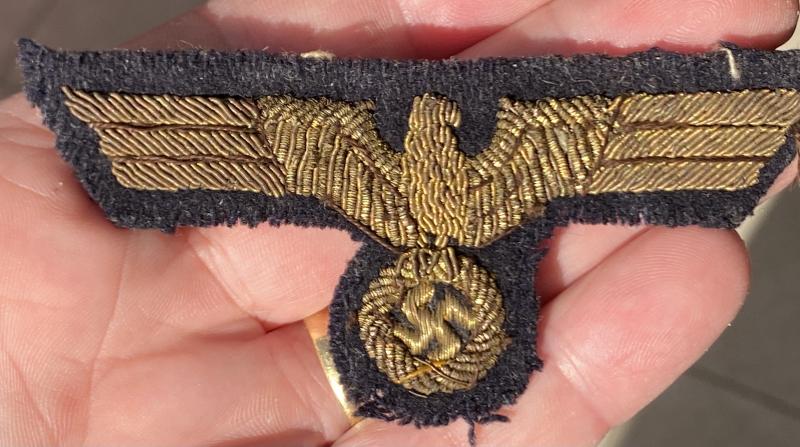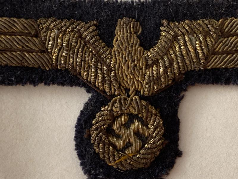 Just purchased from a veterans family member, this is a lovely gold bullion wire Third Reich naval officers breast eagle, on dark navy wool backing. Fantastic quality and probably a very senior officer. No damage or wires loose, complete backing with several threads remaining where is was sewn to a tunic.