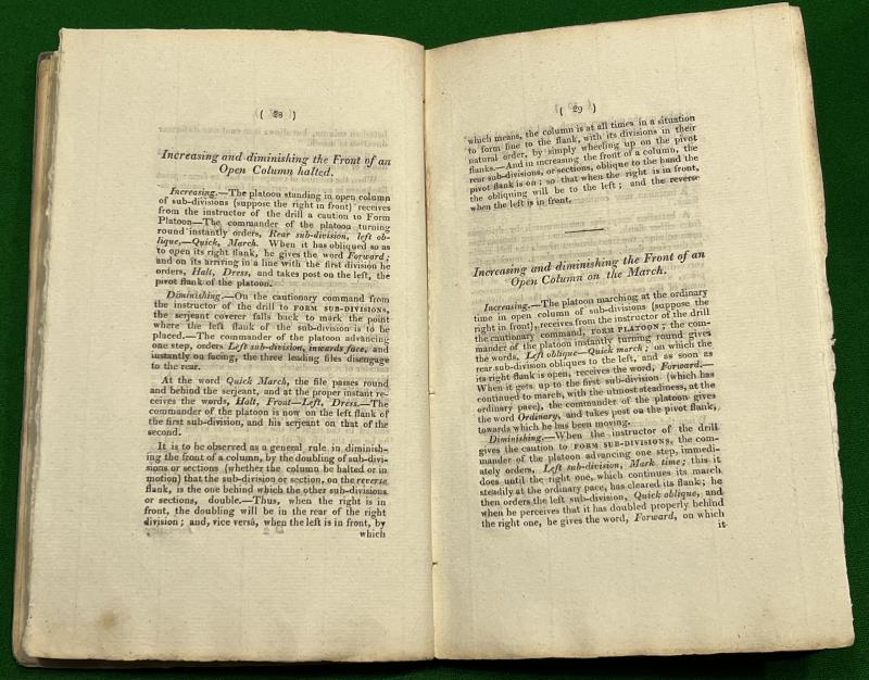 Napoleonic period tract entitled ' Instructions for Training & Exercising the Local Militia '. The 109pg book published in 1809 by T.Egerton, Whitehall covers many aspects of training the Local Militia including the operation and use of the ' firelock ', bugle signals, marching, manoeuvring and hollow squares. Generally clean condition with worn card covers with some staining, minor tears etc. Uncommon and early.