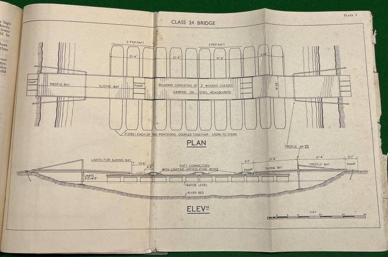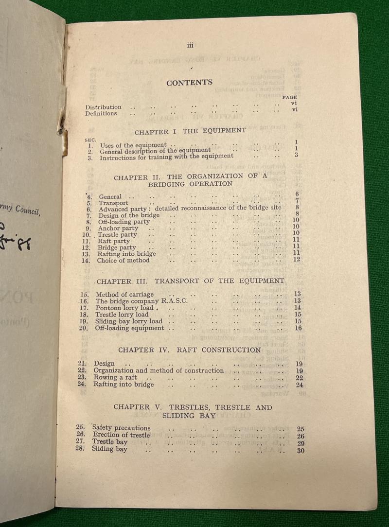 1940 Military Engineering Vol.III-Pt.II Pamphlet No.3 ' Pontoon Bridging ' - Pontoons Mk.V and Trestles Mk.VII. 66pgs + 15 plates covering various aspects of military bridging of the period from equipment, organisation, transport and construction of pontoon bridges. Good, used condition.