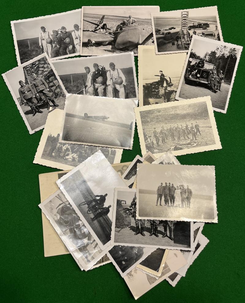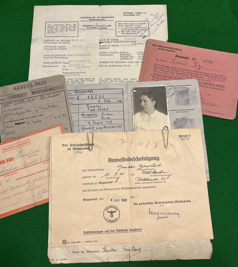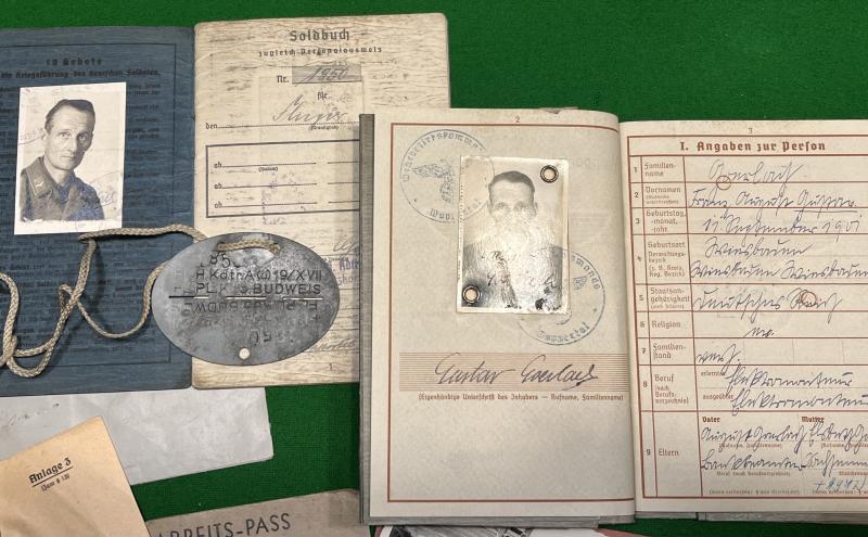 Grouping includes his Soldbuch, Wehrpass, various passes, assorted paperwork including his wife's Kennkarte, POW discharge,28 b/w photographs of personnel, crashed aircraft etc. completed by Goerlach's original dogtag. All items in good used condition.