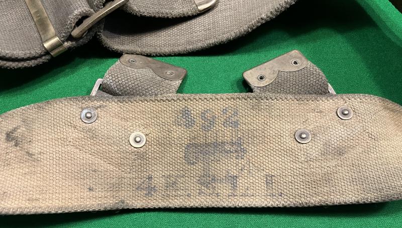 Good example of a British '08 Patt. webbing belt unit marked to the 4th Batt. Kings Shropshire Light Infantry. Faint manufacture and date marks 1916/18 ? Old blancoed finish which has darkened. Good, used condition.