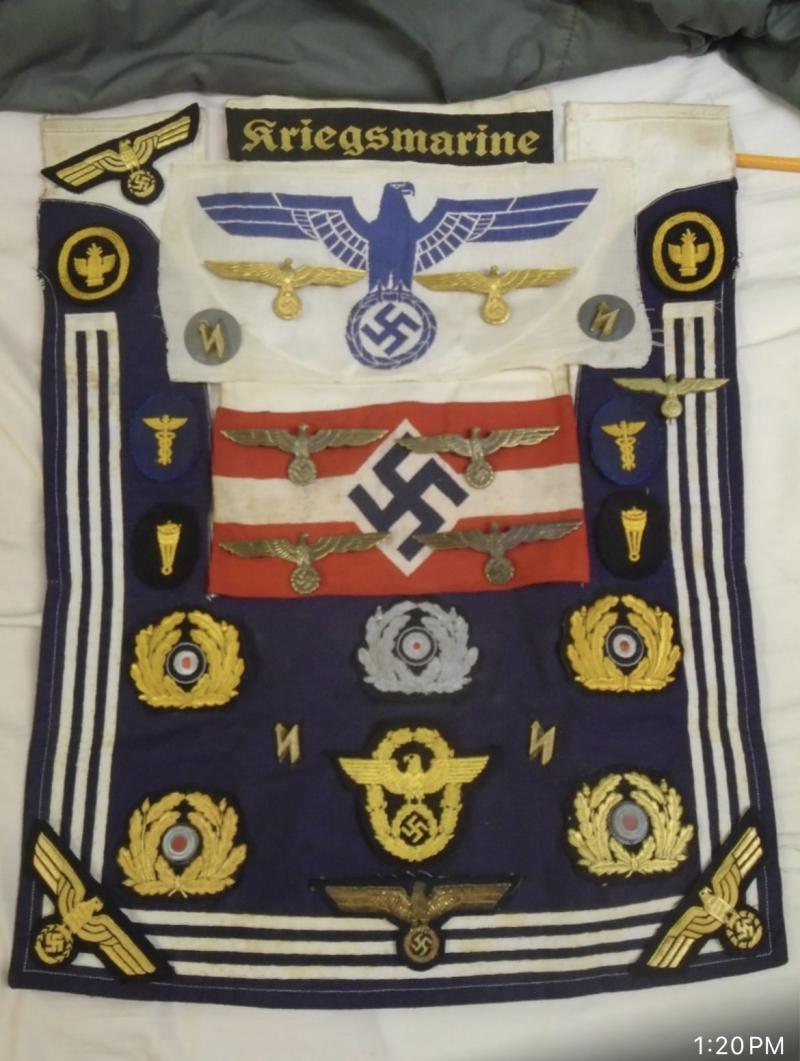 Souvenir of Kriegsmarine service acquired by an Allied serviceman. Consists of a manufacturer marked Kriegsmarine ratings collar onto which a number of original Kriegsmarine insignia were originally attached. The last image shows the collar in it's original condition a number of years ago, the residue offered here was a result of the collar being stripped to ensure various members of the veteran's family retained a souvenir. Offered as one with 13 original items of insignia and the collar.