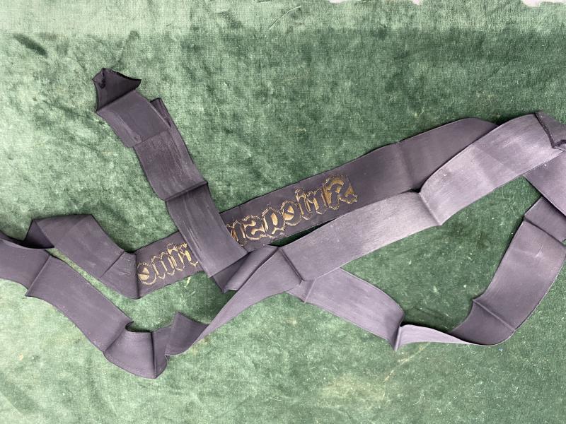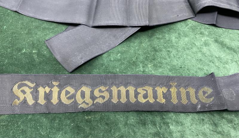 Worn on the Third Reich naval rating sailers cap, commonly known as a Donald Duck cap. This is the FULL LENGTH’ black satin ribbon worn around the rim. Unusual to find a complete, un-cut one, as these are usually shortened to fit on displays. Beautifully woven KRIEGSMARINE lettering in gold wire. Mint condition.