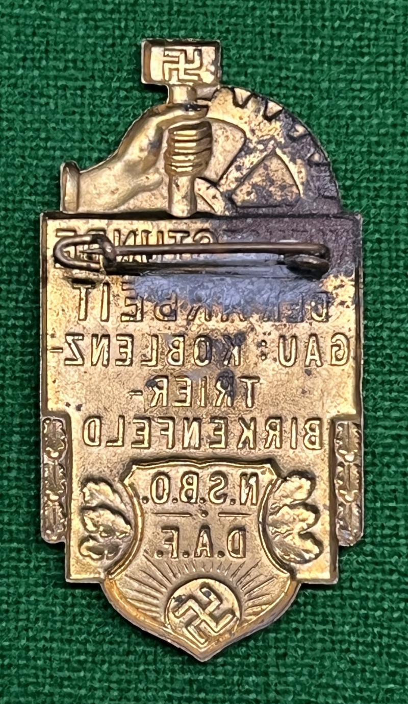 Die struck, pin back tinny produced for the NSBO Weihestunde der Arbeit Gau Koblenz-Trier-Birkenfeld. Good, clean condition with some minor marking.