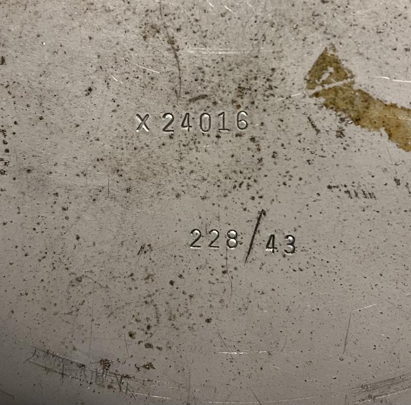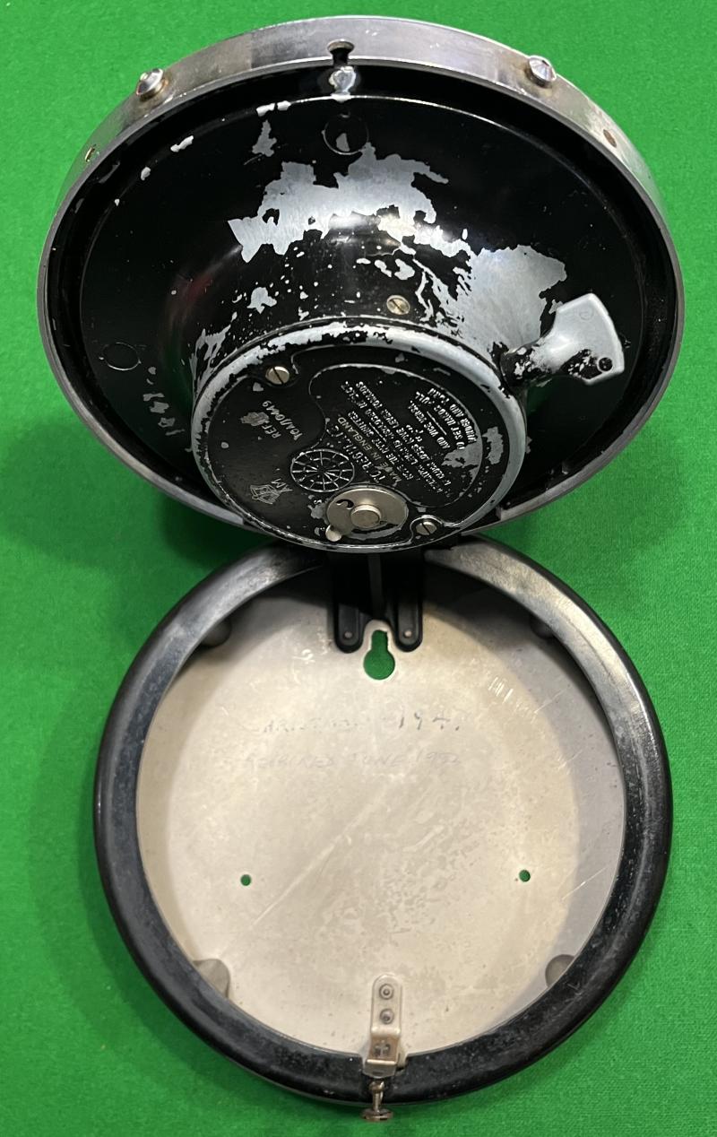 Air Ministry, English made wall clock with 18cm diameter bakelite case and hinged chrome bezel. 14cm white dial with black Arabic numerals and hands, dial now spotted. The movement is integral with the rear of the bezel and dial, it is marked with the stores reference number 10A/10449. Movement has integral winder, appears to keep reasonable time but would suggest a service. Various service dates marked inside of the case and the probable date of liberation ' Xmas 1947 ' scratched into movement. Reverse marked ' X24016 ' and ' 228/43 '.