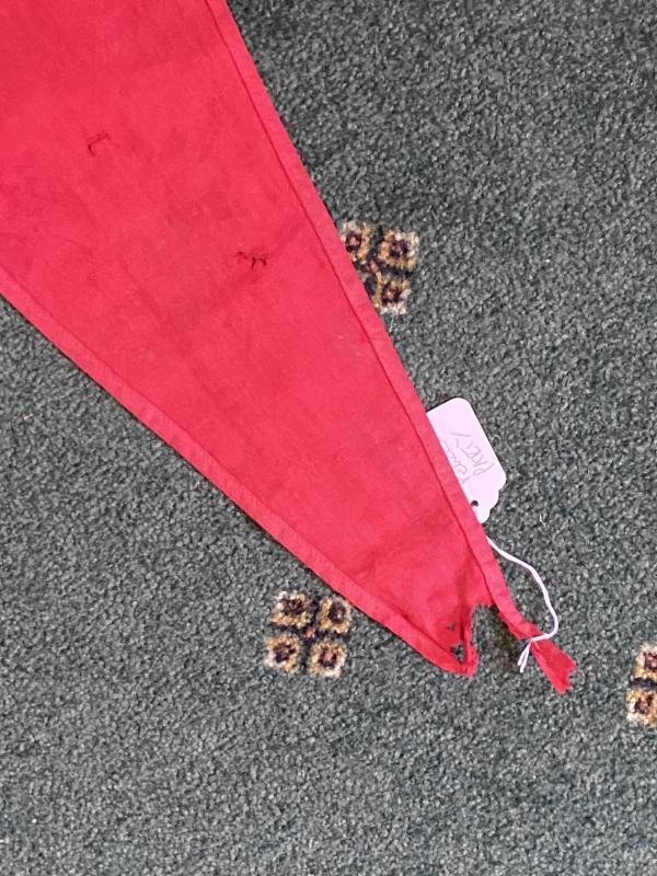 A typical NSDAP/PARTY banner that would have hung in the streets or from a building. Produced at the time probably in the hundreds of thousands. All different sizes, all different qualities. This is an all cotton example with printed swastika on white circle, one sewn to each side. This would have hung vertically from a pole or similar. However, this one has been ripped down and the stocked pocket to the top is no longer there. Other than that, it has a couple of small age holes near the bottom and the tip is a little frayed. It is a good, original example and measures 64” long and 26” at its widest point.