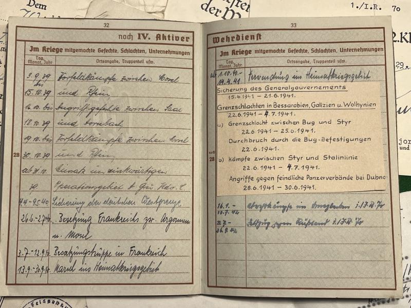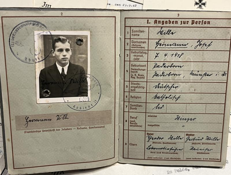 Wehrpass, award certificate and correspondence grouping to Uffz.Hermann Wille of I.R.70. Wille was killed after being hit in the chest by a shell splinter on 26.09.42 south of Mosdok am Terek.in the Caucasus. This occurred in operations undertaken in Operation Edelweiß and almost at the highpoint of the German advance in this area with Kleist's 1st Army.