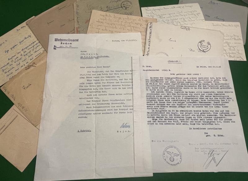 Grouping consists of a well filled Wehrpass showing the 24 year old Wille to be a veteran of operations in France and extensive operations during the invasion of the Soviet Union. He was extensively decorated and the grouping comes with certificates for the Westwall Medal, two for the wound badge in black, Infantry Assault badge in silver and both the EKII and EKI. There is also a number of official and unofficial correspondence both from Wille to his family and from officers and fellow soldiers telling of his death.