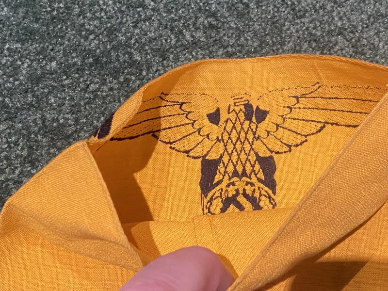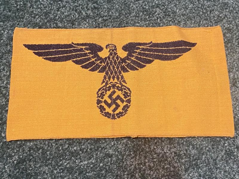 One of the most striking armbands, along with the ‘Recruiting’ one. Just an imposing out stretched black eagle and swastika on a yellow background. These are always black cotton woven into the fabric.
