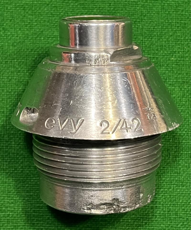 1942 dated German Kz/36 Artillery fuze. Alloy construction with date, manufacturer, inspection and nomenclature clearly stamped to exterior. The Kz/36 has a direct impact action with graze feature and was often used with Kriegsmarine U-Boat deck gun weapons. Excellent clean condition with some nibbling to bottom edge.