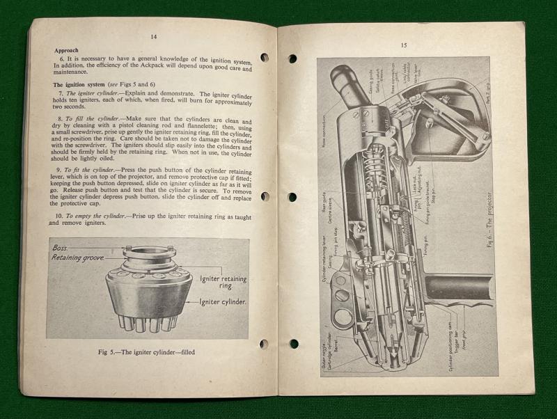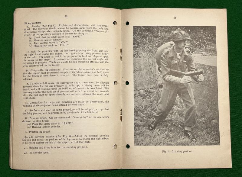 1952 Infantry Training Vol.I - Infantry Platoon Weapons - Pamphlet No.13 ' The Ackpack Flame Thrower '. 40pgs demonstrating the use of the Flamethrower, Portable, No 2. Designed during WW2 with 7000 units being produced between 1943 and 1944 known as the Lifebuoy and latterly as the Ackpack. Illustrated throughout with b/w photographs and diagrams. Good, clean condition with some light fading to covers. Uncommon.