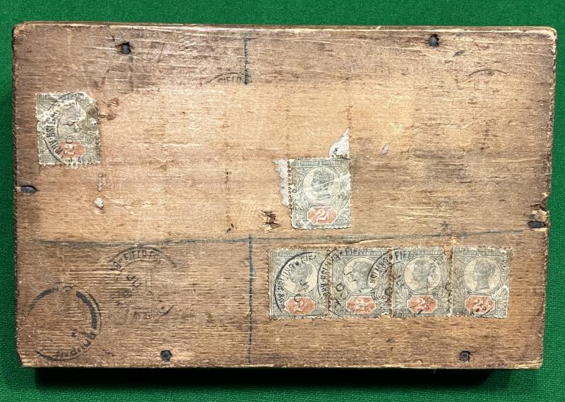 A Queen Victoria gift chocolate box, 1900. In 1899 Queen Victoria decided to send a gift of tin boxes of chocolate to her troops serving in South Africa. It was intended that every soldier and officer should receive a box with the inscription 'South Africa 1900' and in the Queen's handwriting 'I wish you a happy New Year'. Contained in a litho printed tin with rounded corners for ease of storage in a soldier's knapsack and containing a half-pound of vanilla chocolate. This example was mailed home in a purpose built wooden box which is now missing its lid and displays a number of stamps to the reverse. The tin itself is now sadly empty but still retains the original wrapping to the missing chocolate with a ribbon tie. evocative souvenir of the Boer War.