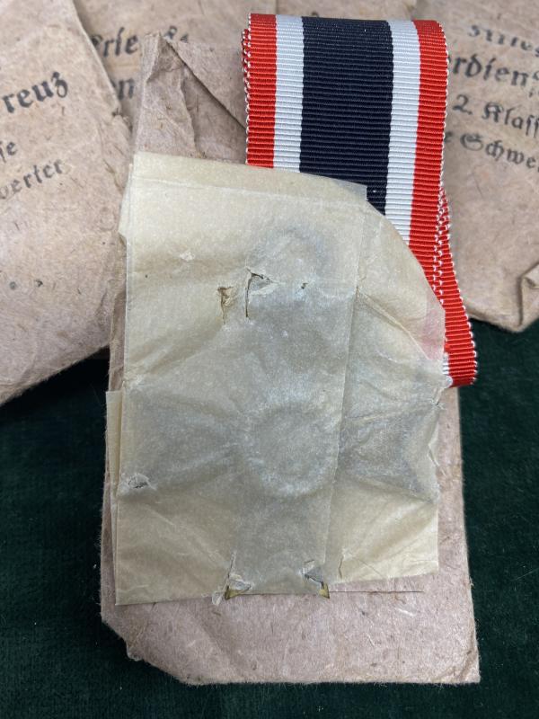 Following a recent trip the biggest militaria show in the world, I picked up a few interesting pieces. On the table next to ours was an American dealer with a variety of items, one was a foot locker from an American GI veteran. Amongst the cloth items and US bits and pieces, this GI had obviously raided a factory or retail shop and bought back these medals. All are untouched, in the original factory brown paper envelopes, with the medal wrapped in wax paper. Unopened! The original length of ribbon is folded inside. These are all War Merit crosses 2nd Class without swords in bronze finish.Each packet is marked on the reverse with the same makers ink stamp. I have 6 examples. All made by Gebr. Bender Oberstein/Rafe