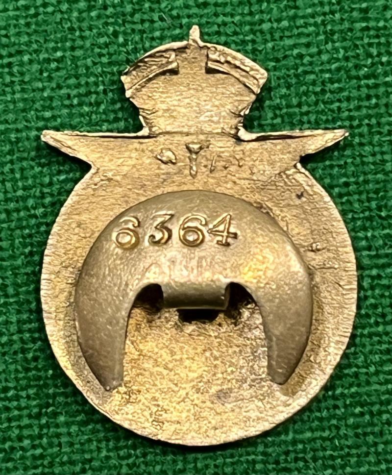 Probably WW1 period ' Aeronautical Inspection Directorate 'lapel badge. Red enamel gilt title circlet surmounted by a Crowned wing 'On H.M. Service' with 'A.I.D' to centre on black enamel ground, the reverse impressed with official issue number ' 8364 '. Good condition, complete with buttonhole lapel fitting, undamaged enamel with minor surface abrasions. Height 32mm.
