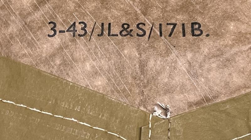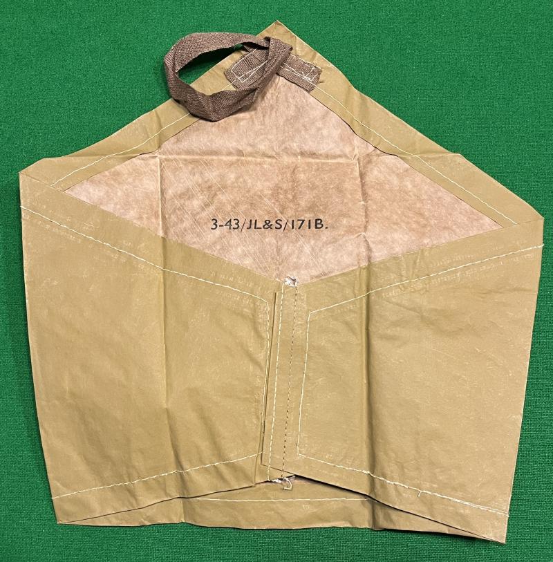A scarce example of the British gas detector brassard. Manufacturer marked and dated 1943 to the reverse, this is the light buff version which has a coated layer which reacts to the presence of mustard gas. This example was found folded in with the gas goggles pack in a respirator case with the mark to brassard caused by the gas goggle forehead pad, otherwise excellent condition.