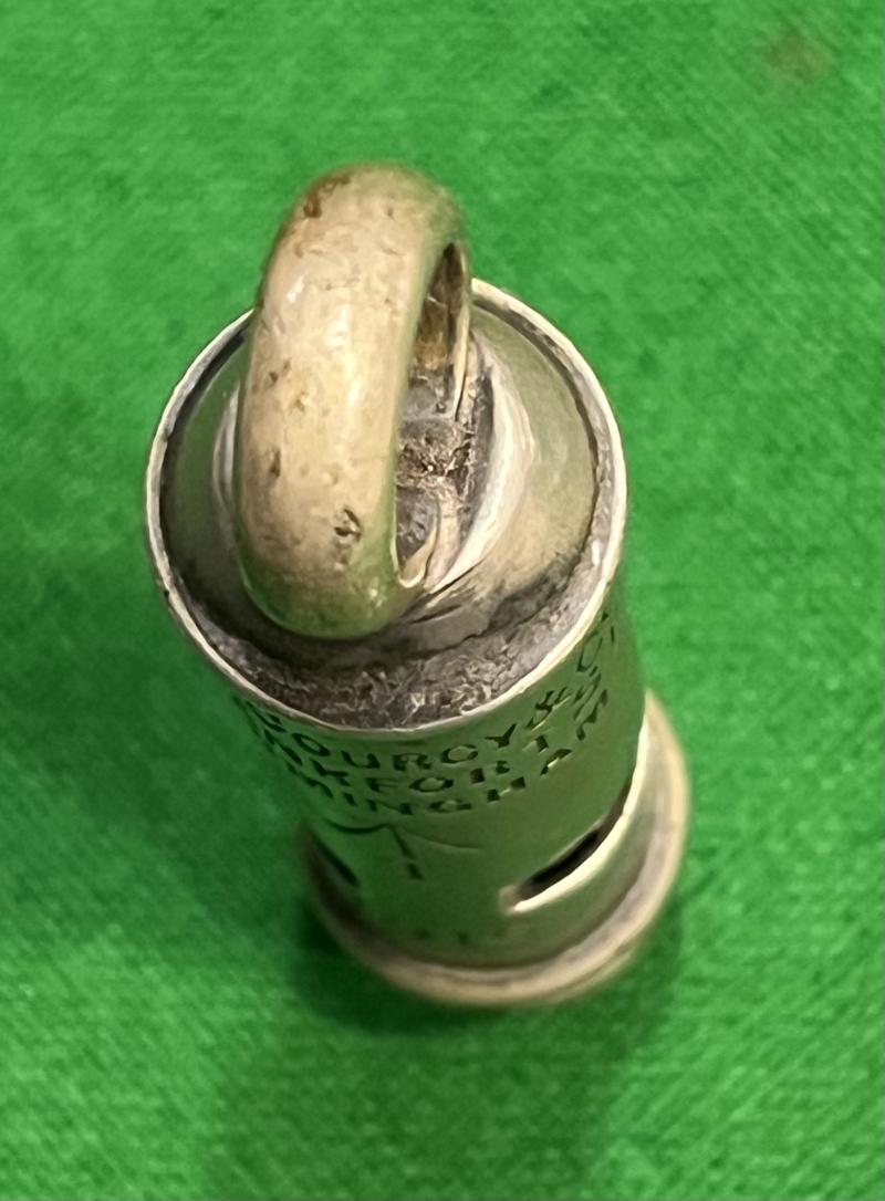 1916 dated nickel whistle by A.De Courtney & Co., Frankfort st,Birmingham with Indian Army issue markings. In good condition, patinated overall with some light marking to plating.