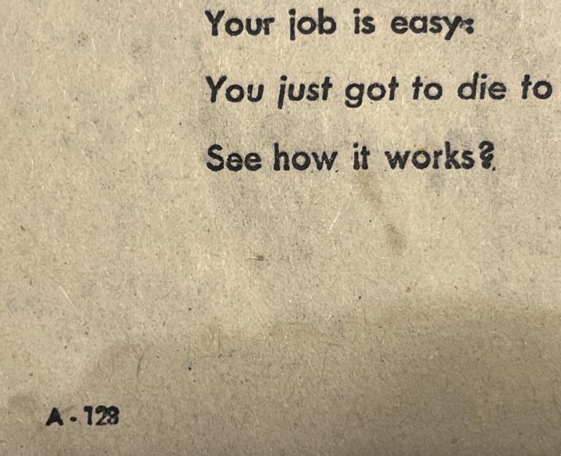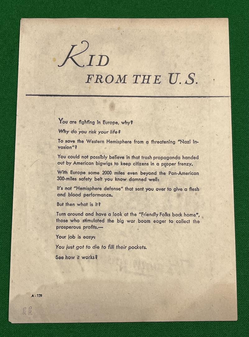 1944 German English language propaganda leaflet ( A-128 ) directed at American troops, circa 1944-45, entitled - ' It's Your Job to Die '. Light marking otherwise good, clean condition.