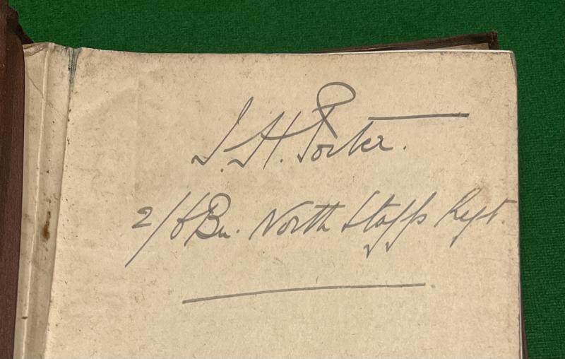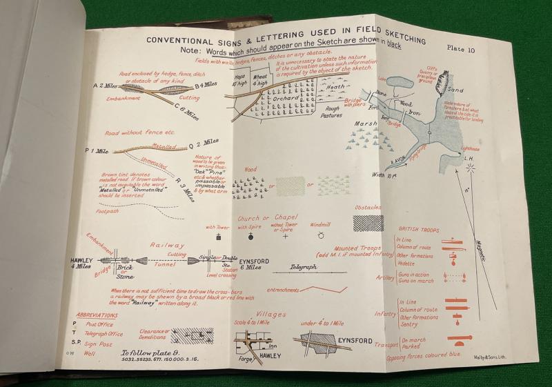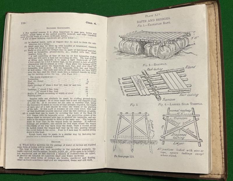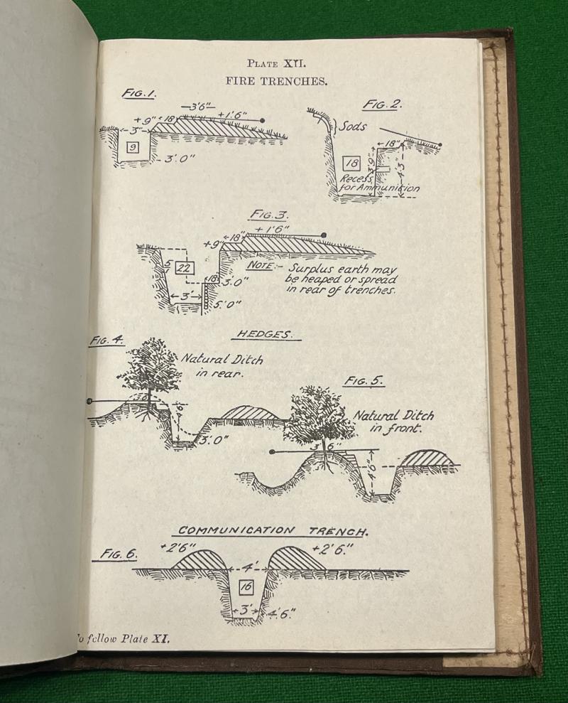 1914 ed. Field Service Pocket Book 1914, 290pgs with fold-out plates, comprehensive aide-memoire covering subjects as diverse as demolitions, courts martials, first aid, bridging, knots , latrines,etc. Carried by officers on active service, in this case to an officer of the 2nd Btn.North Staffs. In excellent, clean condition with some marking and creasing to protective cover.