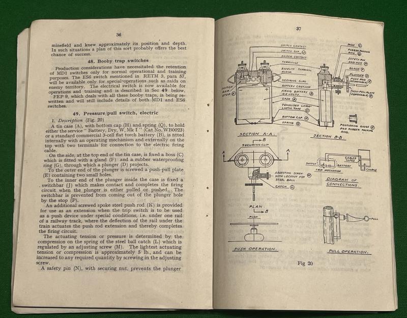 1943 RE Training Memorandum - No.5. 62pgs covering subjects as diverse as traffic lanterns, Bailey and suspension bridges, mine lifting and demolitions. Most interesting is the large section on booby traps, both British and German with diagram and exploded drawings of the pressure/pull switch, electric. Good, used condition, staples absent.
