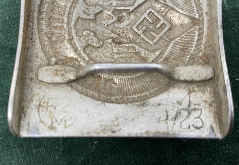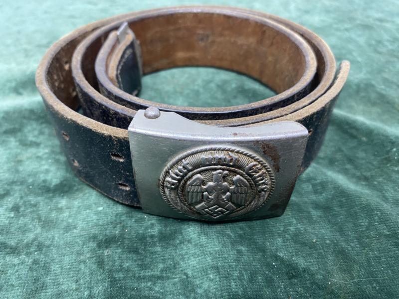 A nickel plated Hitler Youth belt buckle with black leather belt. The belt is a full sized adult length 100cm, so has been altered to fit a slim youth by the addition of many adjustment holes Leather is good condition otherwise. The buckle has some slight corrosion to the surface but otherwise excellent. Reverse is marked with a stamped RZM circle and RZM code 4/23.(Franke & Co., Lüdenscheid).A nice used and as worn combination.