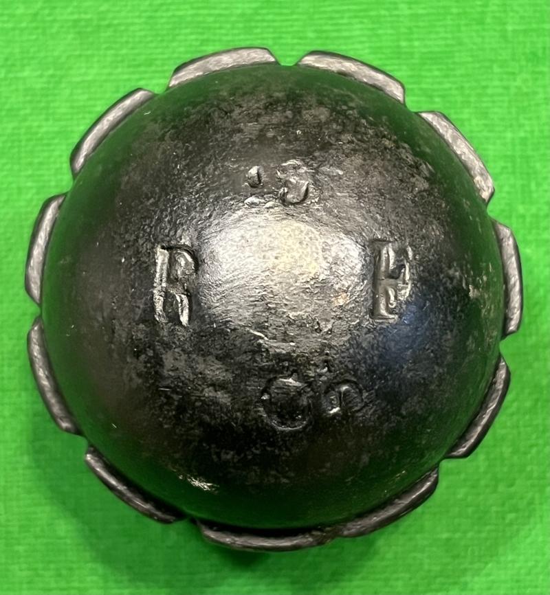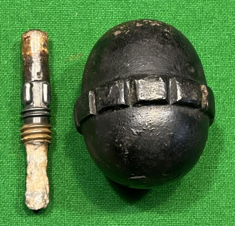 An example of a WW1 German Mdl.17 Eierhandgranate Na. Less cumbersome,than the heavy Kugelhandgranaten or unwieldy Steilhandgranaten (stick grenades), the egg grenade was an ideal compromise fulfilling the function of both an offensive and a defensive grenade. This example is fitted with the Mdl.15 fuze, probably the 5 sec delay which still has vestiges of its paper seal but missing the wire pull. Manufacturer marked to one end.