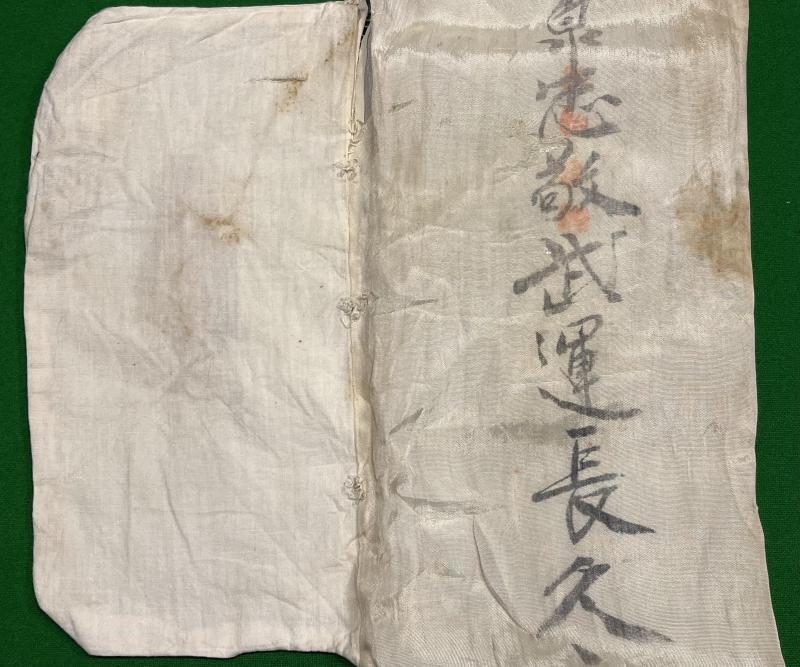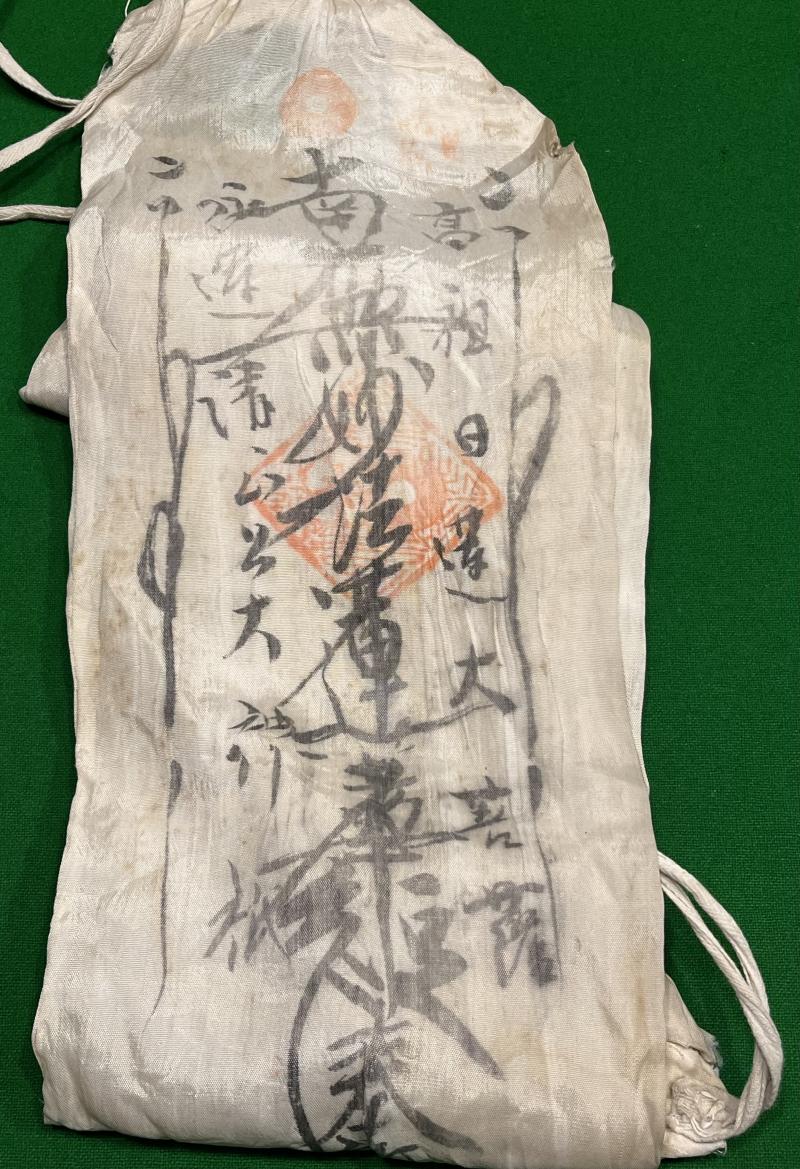Silk belt with ties ( approx.110cms ) with exhortations to confer good luck on the wearer going to war. It appeared that this item was originally a double sided banner painted to one side with various characters and temple chop marks. At some point the original owner has sowed, relatively crudely, a set of cotton ties to each end and a cotton envelope or pouch to the centre. This bag contains a number of good luck offerings collected from temples and shrines. Individually wrapped wooden and silk shapes featuring various hanko and pictograms were sent to loved ones as symbols of good luck and often, as in this case were carried together in a bag. This example is crease and stained through wear with a possible blood stain to the centre.