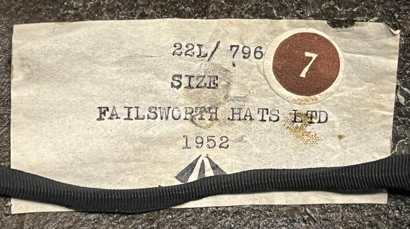 An uncommon, short lived pattern of cap adopted by the WRAF in the early 1950's. Cap is manufactured in felt on a hard shell, with plastic chinstrap secured by black plastic KC RAF buttons. A plastic KC cap badge is mounted on a black half ribbon. Leather headband to interior with original manufacturers label ' 22L/796, Size 7 Failsworth Hats Ltd 1952 ' with broad arrow. This style of cap bridges the gap between the wartime soft WAAF cap and the later WRAF "stewardess" type cap. Good, clean overall condition with some minor moth grazes.