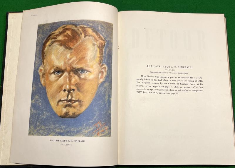 1st ed.1946 ' Detour. The Story of Oflag IVC ( Colditz ) Edited by Lieutenant J.E.R Wood (Royal Canadian Engineers). 183 pp. with illustrations and accounts of internment at Colditz ( Stalag IVC ). Includes drawings by Lieut. J.F Watton (Border Regiment), with colour plates of some of the personalities including men such as Mike Sinclair and David Stirling. Good, used condition with some light marking to covers and slight foxing.