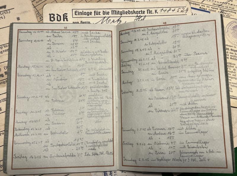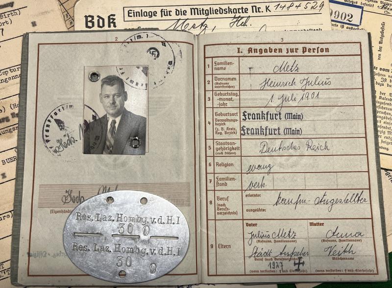 An ephemera, Wehrpass and dog tag grouping to a medic NCO. Uffz. Heinrich Metz, a pre-War member of the DRK as evidenced by his DRK ausweis went onto serve with a number of Reserve hospitals before joining various medical units including 2.( Marschkomp ) San.Ers.u.Ausbild.-Abt.9, 2 San.Komp.715( mot ) before ending up with 5 Coast.Guard Bn.686 with whom he was serving when captured in April 1945. His original dog tag was marked ' Res.Laz.Hombg.v.d.H.I. '. It is apparent from his Wehrpass that Metz. became a San.Uffz. in 1942 and was serving in Italy in the later part of the war. Grouping includes a number of ausweiss and various other period pieces of ephemera. Plenty of scope for further research. All items in good, clean condition.