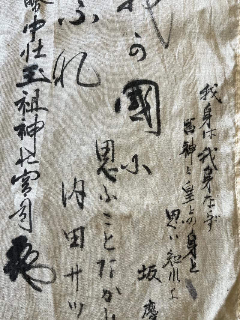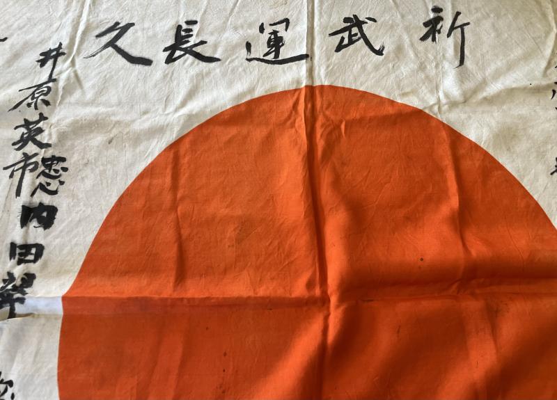 Japanese yosegaki hinomaru or good luck flag. Approx 83 x 68cms printed on silk with two leather reinforced corners and cotton ties. This example is covered in a large number of characters in different hands with prominent larger characters forming the exhortation ' Ki Buun Chokyu ' translating as ' I pray that your military fortunes are long lasting.' Prominent red ' chop ' to one corner. Both leather corner reinforcements and ties are intact with some very minor contemporary staining and fold marks. Good large example.