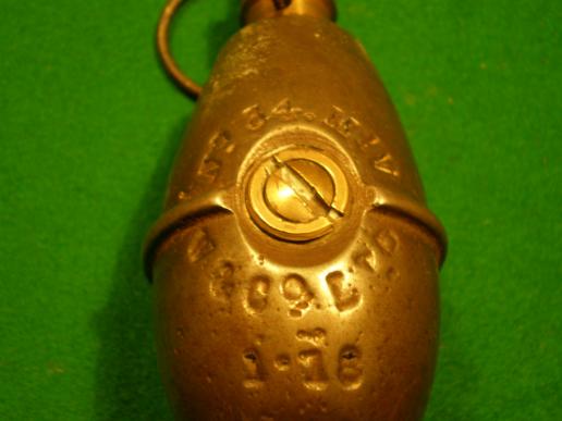 WW1 No.34 Mk.IV British Hand Grenade, often referred to as the ' egg grenade '. Introduced in 1918, the Mk 4 differed from it's predecessors by having a flange around the middle to aid grip. This example clearly marked ' No.34.MK.IV ' and manufacturer marked ' W & Co.Ltd ' and dated January 1918. In good, strippable condition. Excellent example.