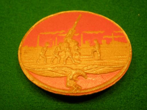 2 x pressed card day badges sold in aid of the Luftwaffe, one in flight colors showing an aircraft and another in red showing a flak gun. In good overall condition with both pins intact. Priced as a pair.