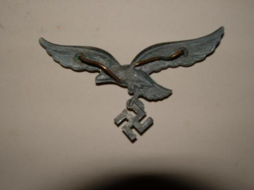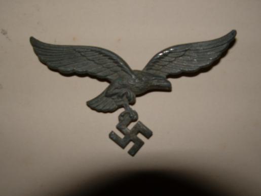 Original grey zinc eagle for the NCO's Luftwaffe visor cap. Also used on strange winter caps etc etc. Aged but in good condition, both brass pins to the rear are in tact.