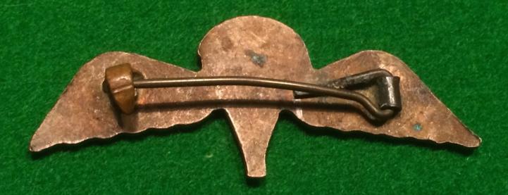 WW2 Period, brass and enamel pin back badge in the form of a British parachute qualification badge. Enamel flaw to r/h wing and small chip to l/h wing, priced accordingly.
