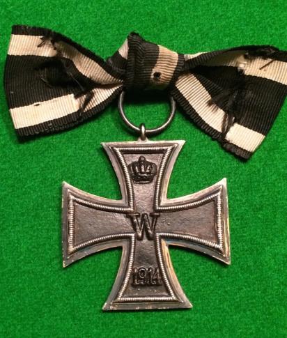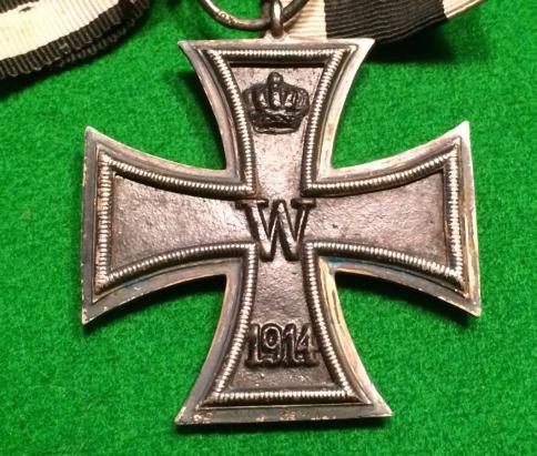 A good, heavily toned example example of an Imperial EKII, which has a nice clear maker’s mark of ' KO ' on the suspender ring, for Konigliches Munzamt of Berlin. It is the typical three part construction with a magnetic iron core with original silk ribbon which has been tacked to create a bow.