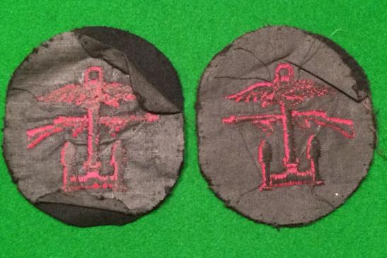 A good pair of used examples. Red eagle, Tommy Gun and anchor embroidered on navy wool ' tombstone " that have been cut and shaped into ovals The badge was designed in 1942 by Lieutenant D.A. Grant RNVR. In excellent unmothed condition with clear indications of having been removed from a uniform..