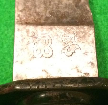 A good example of the small, unofficial fighting knife as carried by many WW1 German troops. 135mm single edged knife with manufacturer's marks to the ricasso, in this case the helmeted knight of WKC - Weyersburg, Kirshchbaum & Company, Solingen. Painted steel grip impressed and painted to give the appearance of horn with accompanying scabbard. Initials have been scratched into the reverse of the hanging strap. Good, overall condition with stained blade with minor edge knicks and scabbard missing the male half of the popper of the retaining strap fitting.
