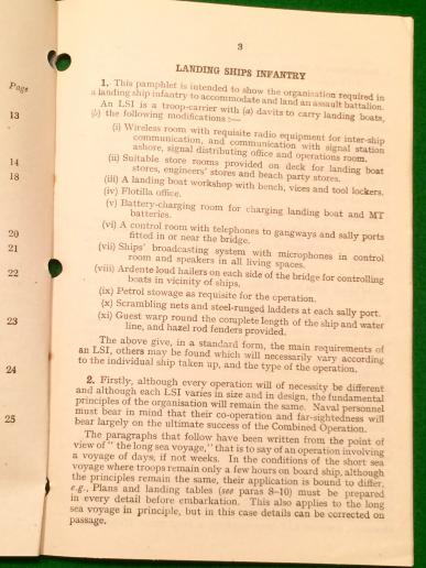 1943 Combined Operations Pamphlet No.11 ' Landing Ships Infantry '. 25pgs outing the operation of LSIs , embarkation of troops, approach to beach, tactical surprise, landing etc. Illustrated with diagrams and tables. Excellent, clean condition with some minor rusting of staples.