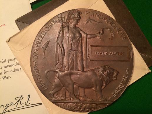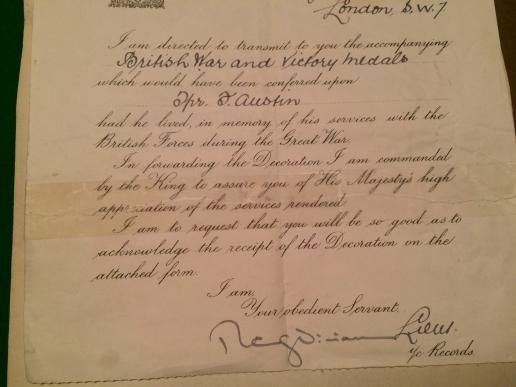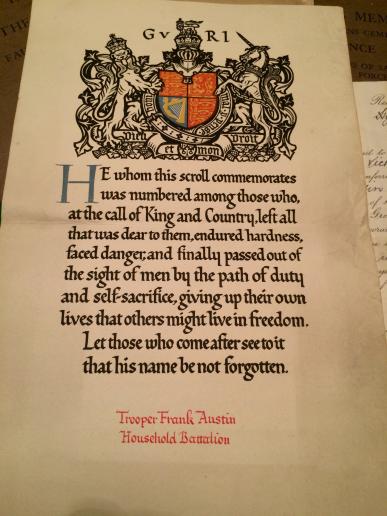 WW1 Pair to 2163 L/Cpl.Frank Austin Household Battalion who died 03/05/1917. Accompanying the pair, boxes of transition, partial envelope and Records Office slip. Death Plaque in original slip and card container, Memorial scroll and condolence letter with a souvenir booklet and roll of the Household Cavalry Memorial service at Westminster Abbey in 1919. Also two CWGC booklets for the Arras Memorial. Austin is listed in both of the publications.