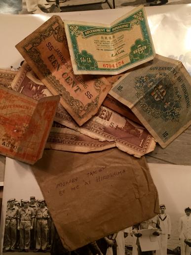Group consists of Edward's medals, 39-45, Pacific Stars and War Medal in original box, various items of RN insignia, ration cards, passes, orders etc, personal photographs and a number of 10 x 8  photographs showing the Japanese surrender at Rabaul. These are accompanied by smaller but differing views of the surrender. There is also an official photographic copy of the ' Instrument of Surrender ' and some Japanese money collected on a trip to Hiroshima . Interesting grouping to the forgotten war.