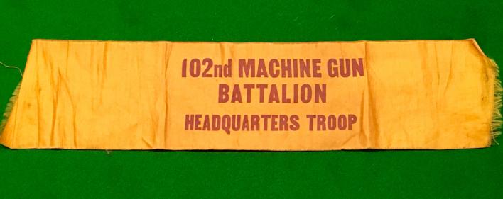 Silk armband, with printed details ' 102nd Machine Gun Battalion Headquarters Troop '. In good , clean condition with signs of having been fastened with a safety pin.