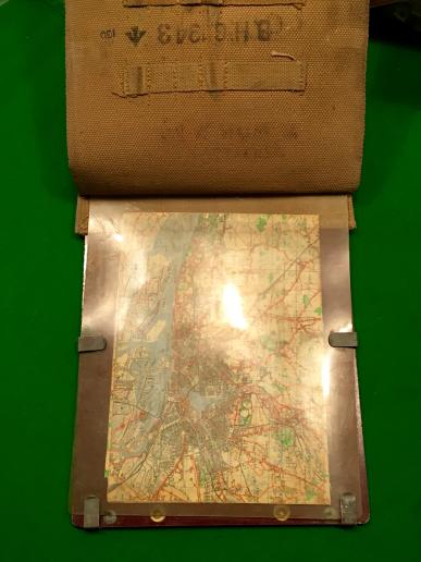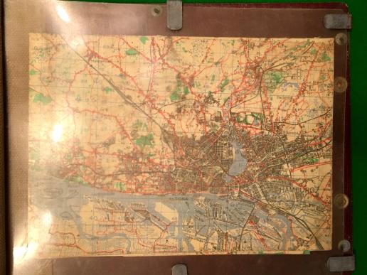 WW2, 1943 dated map case belonging to Tpr.J.Henshaw, 33rd Armoured Brigade, 148th Bat. RAC, 9th Bat. The Loyal Regt. with copy of the original embarkation draft for D Day showing him embarking with jeep no.M5559755 whose number also appears on the outside of the case. Case in good, used condition containing a wartime map of Hamburg.