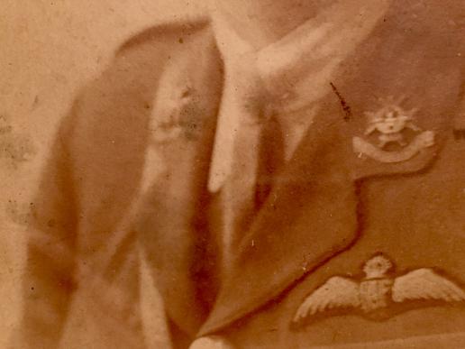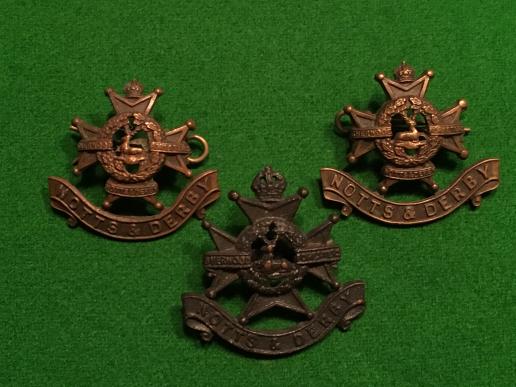 10 x 15cm portrait of an officer sporting 1st Pattern RAF wings and wearing the collar and cap badges of his parent regiment - Notts and Derbys in a contemporary frame. Accompanied by a pair of bronzed collar badges by Gaunt and a bronzed cap badge with both blades intact. Recent local saleroom acquisition.