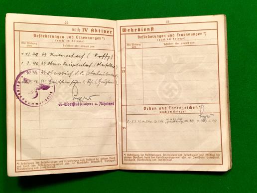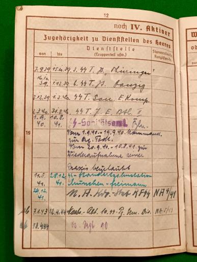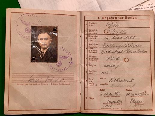 SS Wehrpass to a Dr Willi Dorr who served with 10th SS Panzer Div. Frundsberg in France during 1944. The wehrpass was apparently, according to accompanying letters, lost on the unit's retreat through Normandy. Dorr served with various SS medical units including a period at Buchenwald and became a dentist postwar. Accompanying the Wehrpass are a number of letters from a German dealer who was able to contact Dorr before his death. Also a personally signed letter from Simon Wiesenthal who found that Dorr had not served on the staff at Buchenwald. Interesting item that would undoubtedly reward more extensive research.