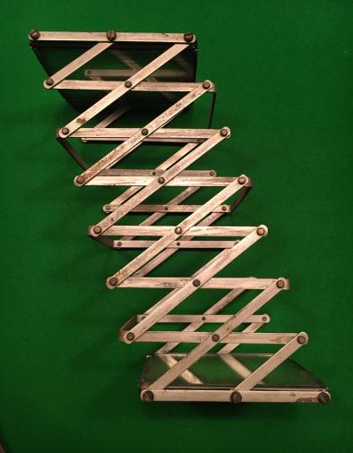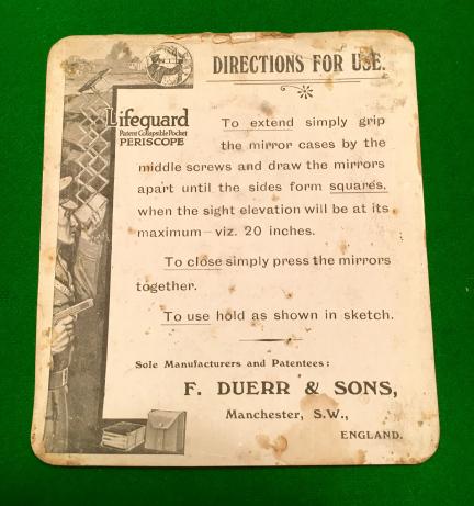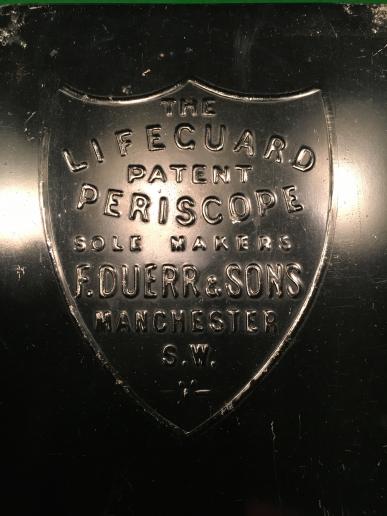 periscope, case periscope (L 13cm (folded) x W 13cm x H 7cm), consisting of two parallel sets of lazy tongs, with mirror holders at each end; complete with canvas carrying pouch. The periscope is marked as folows: THE LIFEGUARD PATENT PERISCOPE / /Sole Makers / F.Duerr & Sons / Manchester, S.W.'