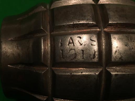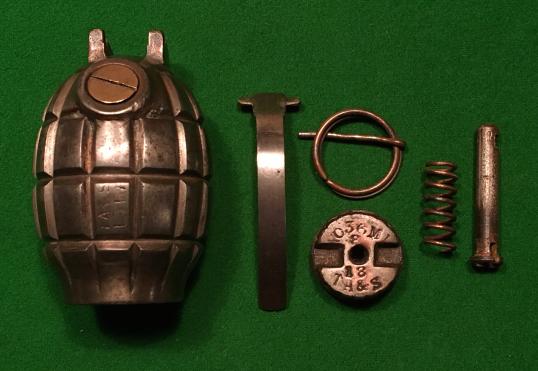 A 1918 dated No.36M MkI Grenade. This example has been lightly plated, presumably as a souvenir, all parts, body, plug and lever are marked ' TA & S 1918 ' indicating manufacture by T.Adshead & Sons, Dudley. In excellent, clean condition with some very minor rubbing to some areas of plating.
