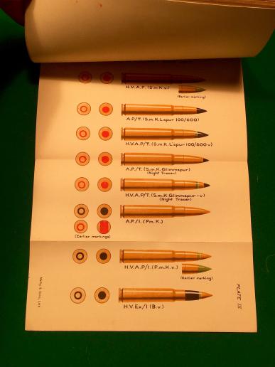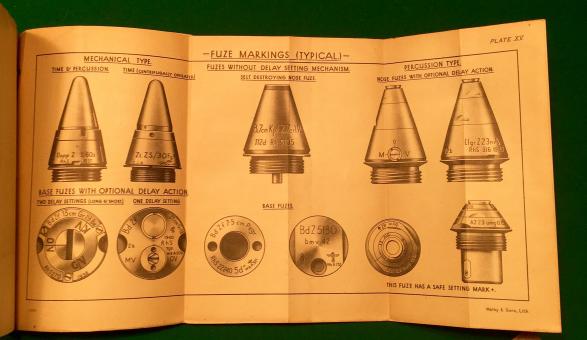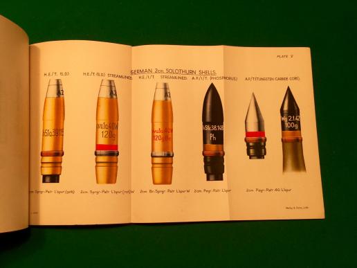 1945ed. ' Handbook of Enemy Ammunition - Pamphlet No.15 - German Ammunition Markings and Nomenclature .' A superb and very scarce manual, detailing the final available information on German ammunition markings. Profusely illustrated with sketches, b/w photographs and diagrams with impressive full colour fold-out plates. Gives full details on filling codes, propellant coding, positioning of markings and abbreviations. Slight marking to card covers and a minor tear and loss to spine. Important and scarce.